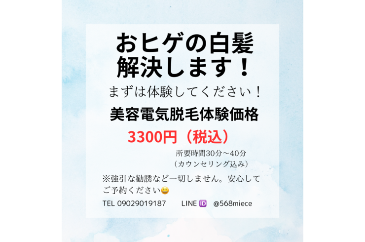 | メンズ脱毛 | 4,000円~(税別) |